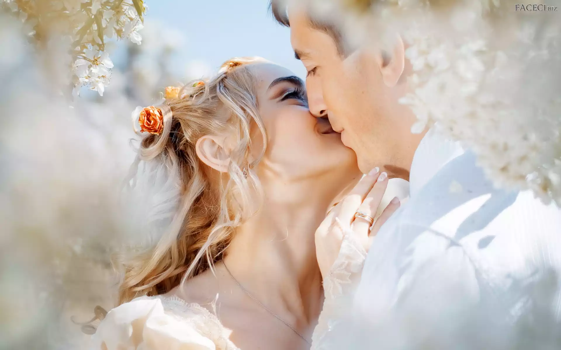 Gałęzie, Kwitnące, Ślub, Nowożeńcy, Pocałunek - faceci.biz